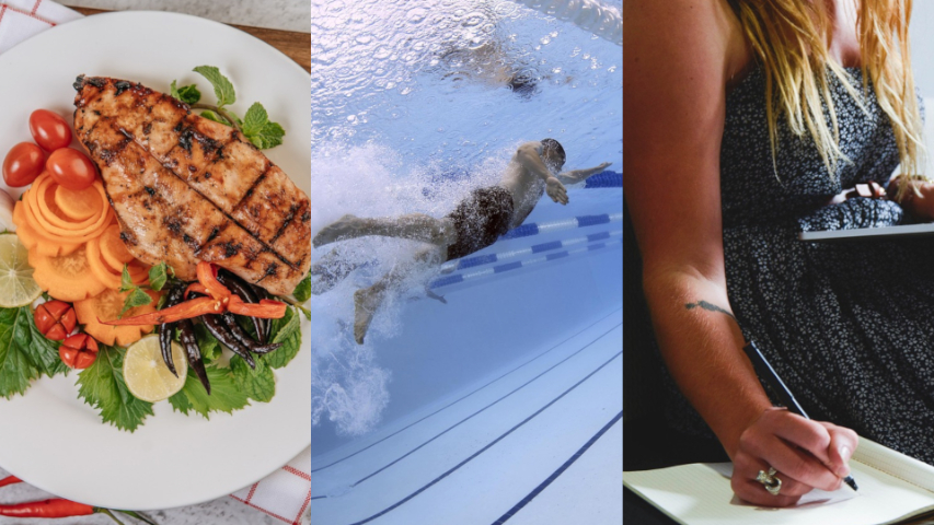 Alimentação saudável, prática esportiva de natação, e escrita para manter a mente sempre ativa.